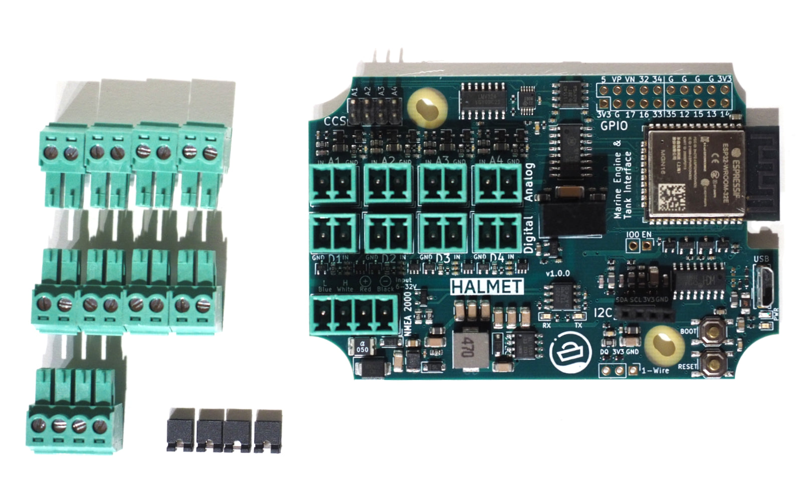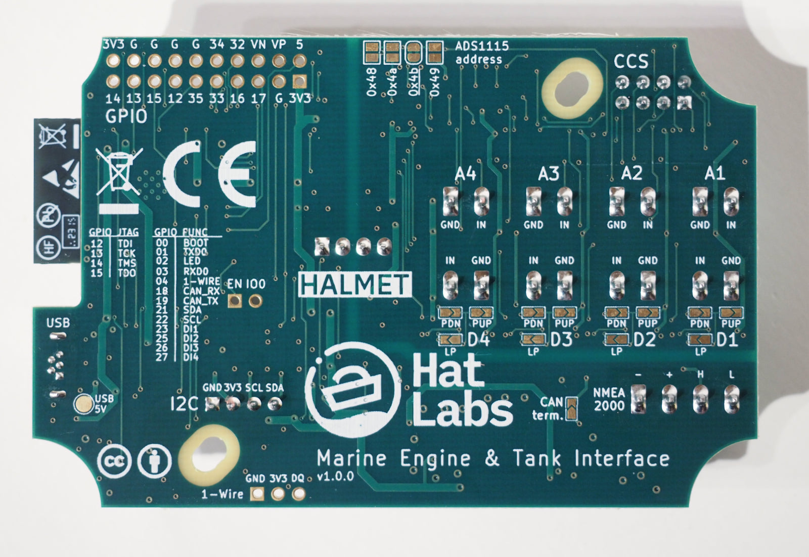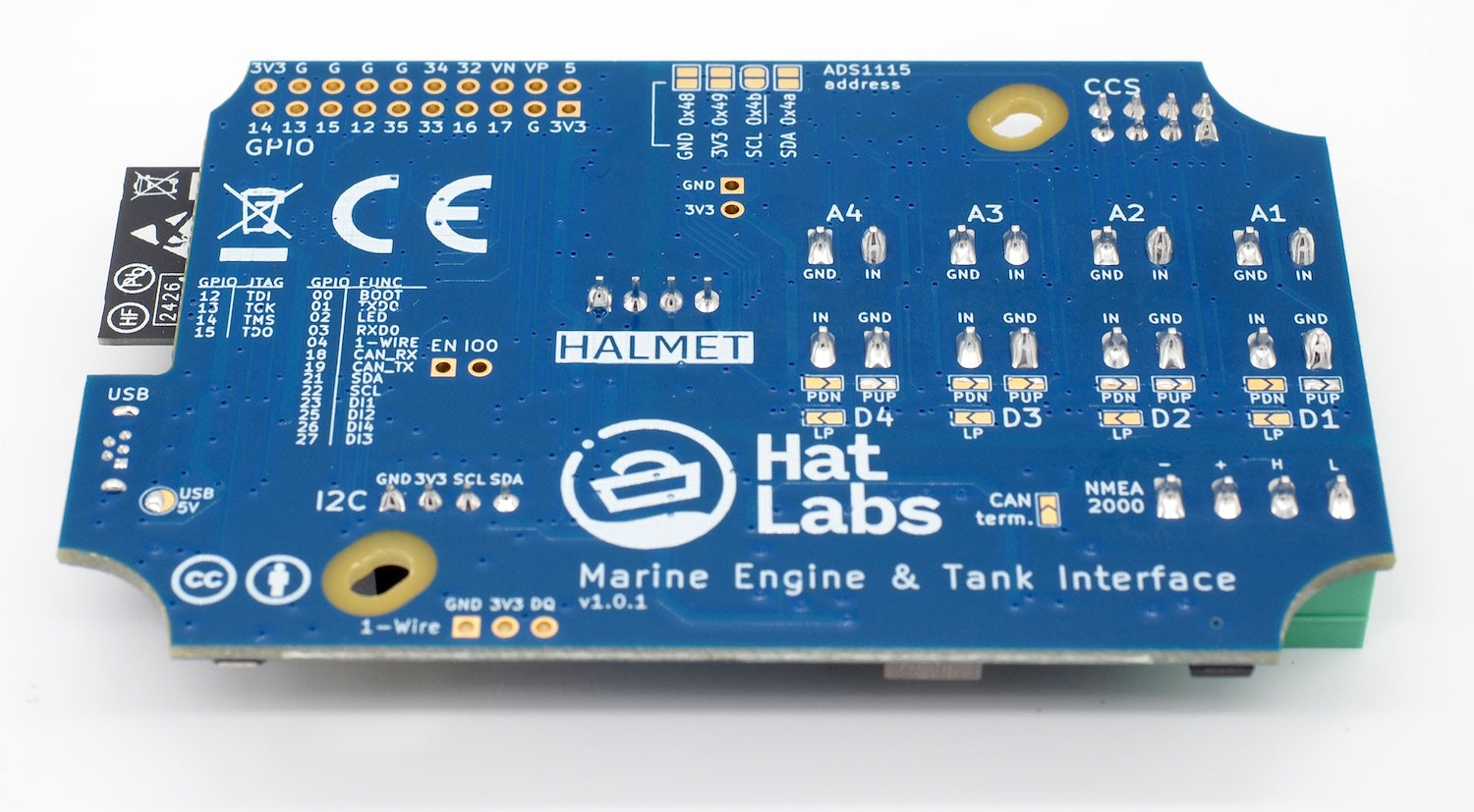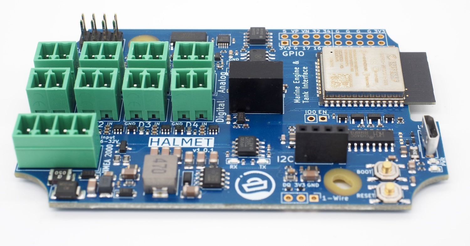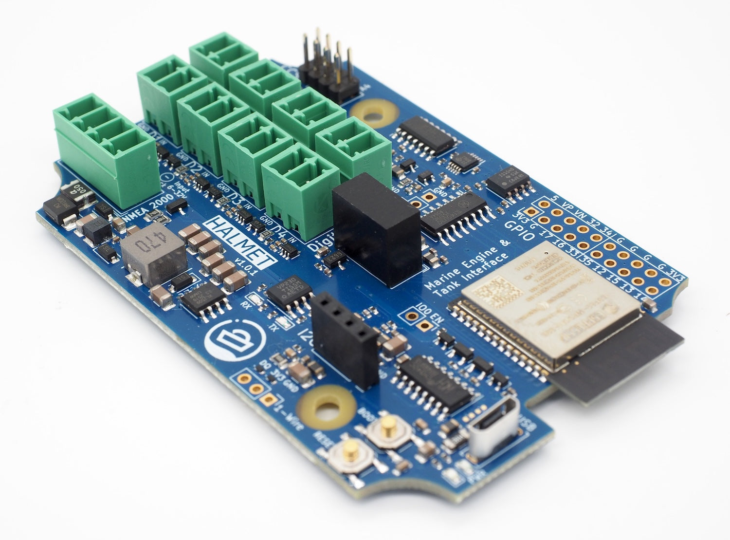 HALMET is the Hat Labs Marine Engine & Tank interface. As a successor to the SH-ESP32 and the Engine Top Hat, it lets you connect your marine engine, tanks and other devices with resistive, voltage, binary or pulse outputs to an NMEA 2000 or Signal K network, with native NMEA 2000 and WiFi support.