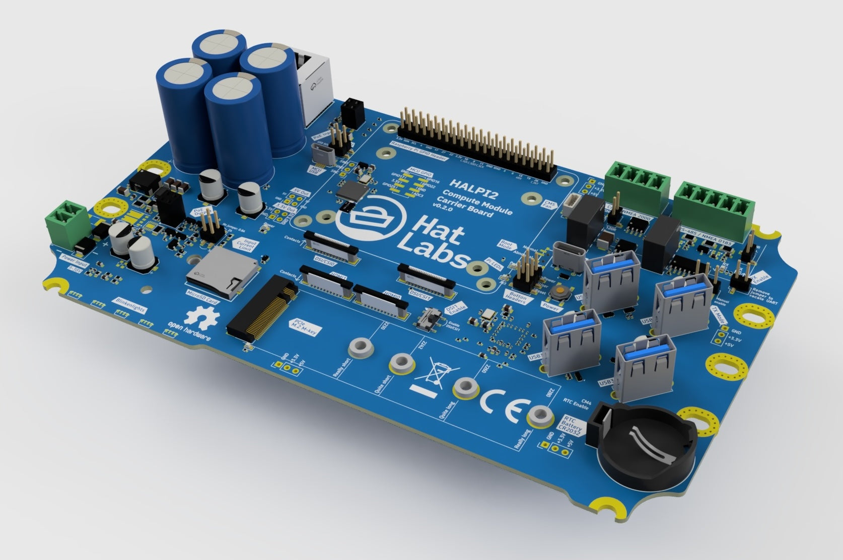 Additionally, there are pre-drilled holes for two more SMA antenna connectors for GPS or mobile connectivity and three 13mm holes for cable glands or SP13 type connectors. Internally, there are two additional USB3 connectors for dongles, GPS, mobile connectivity or other devices. One of the USB3 or Ethernet connectors can be replaced with another HDMI connector if two displays are needed. An isolated NMEA 0183 interface is provided as well. And finally, HALPI2 accepts standard Raspberry Pi HATs in case the stock features are not enough!