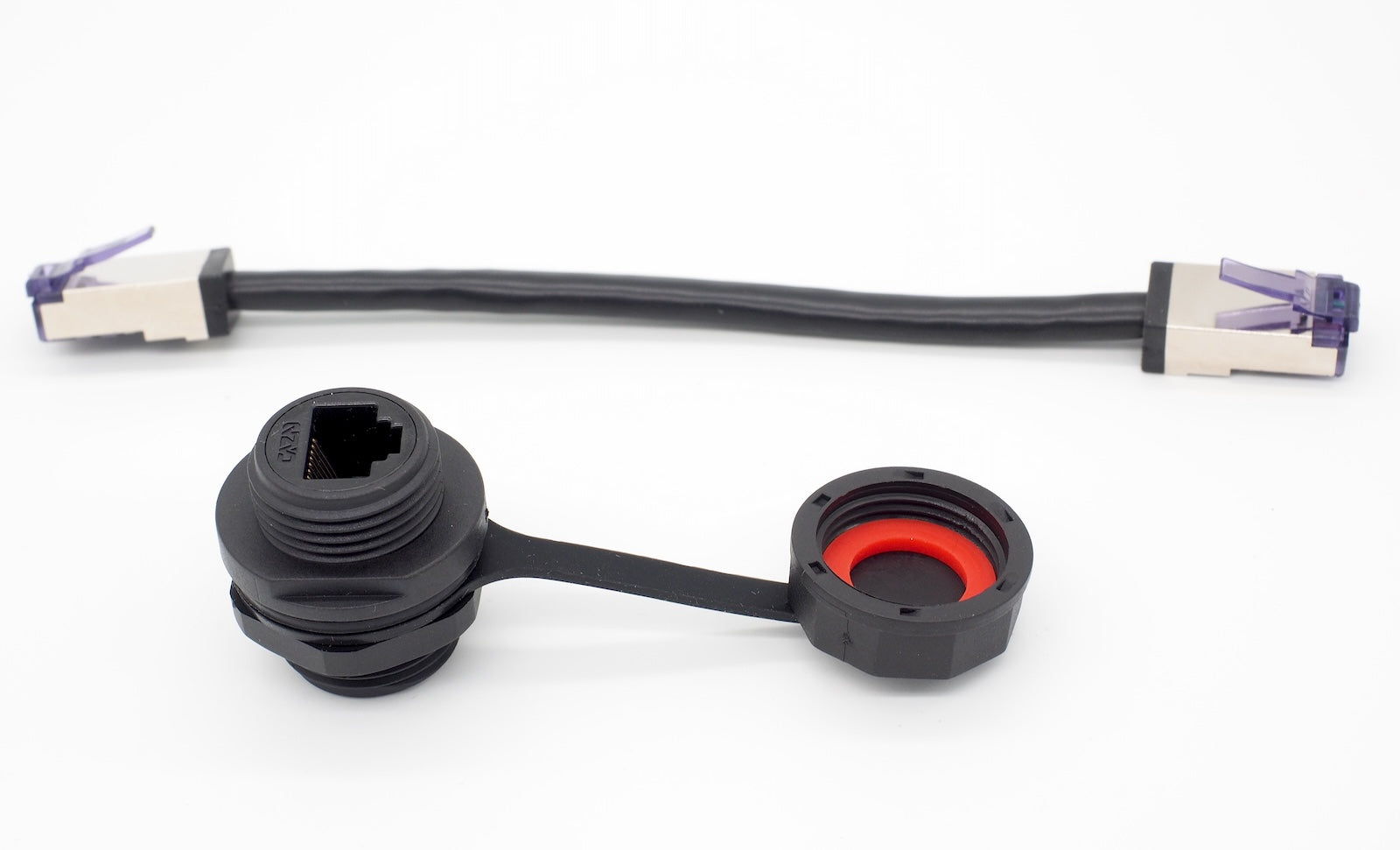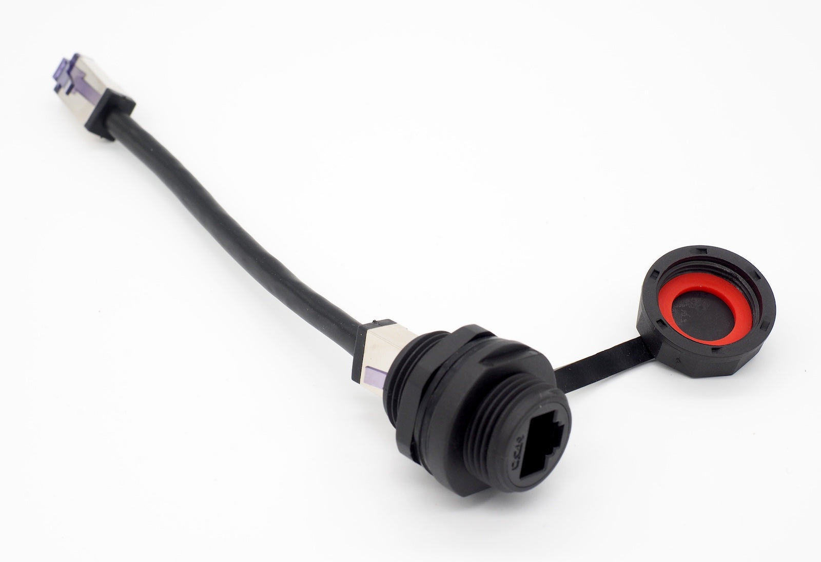 If you want to use wired Ethernet with a Raspberry Pi mounted in a waterproof enclosure, this little connector is for you! It features two back-to-back RJ45-connectors and a 15 cm CAT6 ethernet cable. Connect the Raspberry Pi Ethernet port to the inside connector and an external Ethernet cable to the world-facing connector.