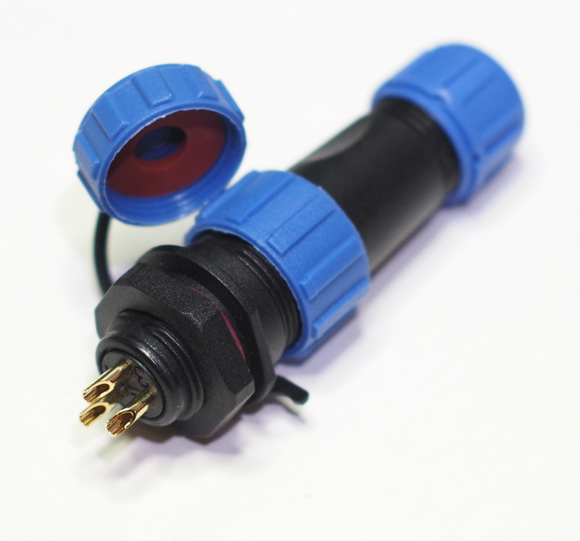 A three-pin SP13 connector with a female plug and a male panel connector. Suitable to be used for connecting externally powered devices to SH-ESP32.